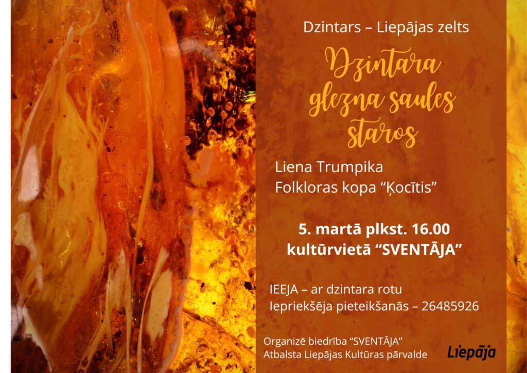 Turpinot Liepājas 400 gadu svinības, aicinām ikvienu interesentu piedalīties meistarklasēs par dzintaru – Liepājas zeltu! 30. oktobrī valodniece Daiga Straupeniece ļaus iegrimt valodas dzīlēs, iepazīstinot ar vārda “dzintars” izcelsmi, nozīmi, sinonīmiem, frazeoloģismiem mūsu kultūrā. Savukārt lauku kapela “Paurupīte” izdziedās skaistās Kurzemes dzintara dziesmas, ienesot siltumu un gaismu rudens dienā. Nāc un sajūti Liepājas dzintara mirdzumu – gan valodā, gan mūzikā! Projektu “Dzintars – Liepājas zelts” organizē biedrība “Sventāja”. Projekts notiek arLiepājas Kultūras pārvaldes finansiālu atbalstu.