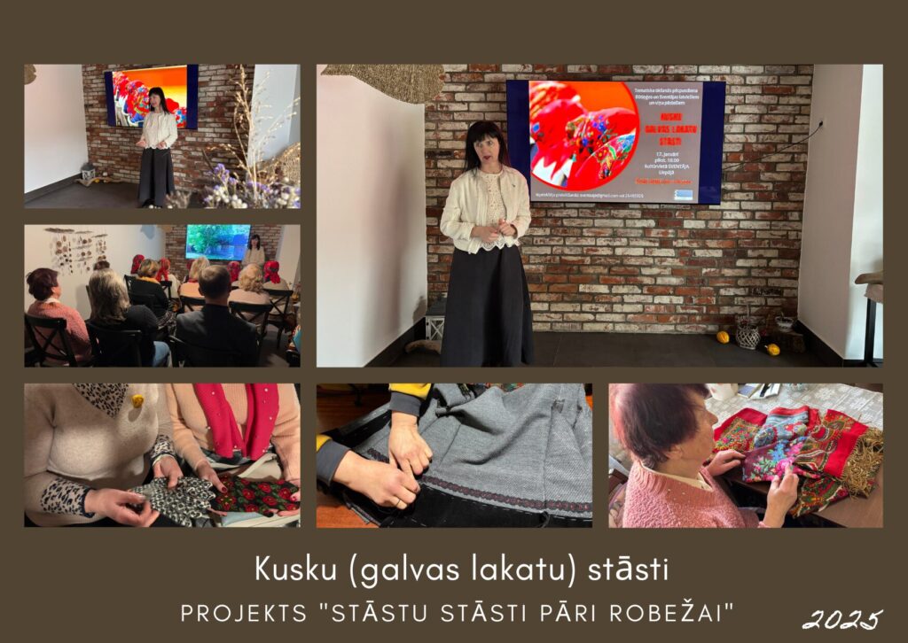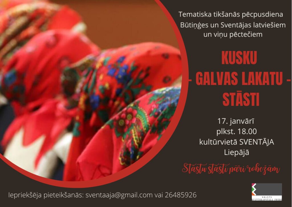 Šī tikšanās veltīta galvas lakatu daudzveidībai, to nēsāšanas tradīcijām un simbolikai. Dalībnieki uzzinās par dažādiem lakatu veidiem un to nozīmi. Praktiskajā daļā notiks dziesmu meistarklase. Tikšanās notiek kultūrvietā SVENTĀJA. Pasākums ir daļa no projekta “Stāstu stāsti pāri robežām”. Projektu atbalsta Valsts kultūrkapitāla fonds.