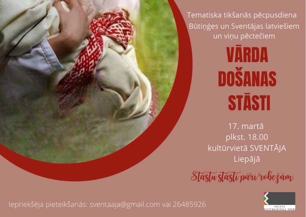 Šī tikšanās ir veltīta vārda došanas tradīcijām. Kā tiek izvēlēti vārdi jaundzimušajam dzimtā? Vai ir meklējamas kādas kopsakarības un tradīcijas? Kuri ir populārākie vārdi Būtiņģē un Sventājā? Dalībnieki uzzinās par krustabu tradīcijām un ģimenes stāstiem. Praktiskajā daļā notiks krekla izšūšanas meistarklase. Tikšanās notiek kultūrvietā SVENTĀJA. Pasākums ir daļa no projekta “Stāstu stāsti pāri robežām”. Projektu atbalsta Valsts kultūrkapitāla fonds.