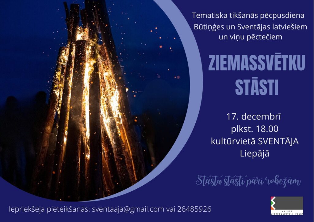 Pēcpusdiena veltīta Ziemassvētku tradīcijām un svētku noskaņai. Dalībnieki klausīsies stāstus par svētku paražām un ticējumiem. Praktiskajā daļā notiks Sventājas ēdienu meistarklase. Tiks gatavoti tradicionāli ēdieni. Tikšanās notiek kultūrvietā SVENTĀJA. Pasākums ir daļa no projekta “Stāstu stāsti pāri robežām”. Projektu atbalsta Valsts kultūrkapitāla fonds.