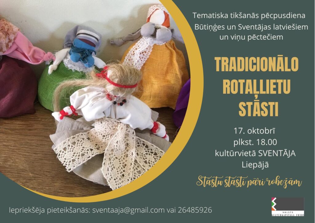 Dalībnieki iepazīs stāstus par senajām pašgatavotām rotaļlietām. Tiks stāstīts par to izgatavošanu un nozīmi bērnu audzināšanā. Praktiskajā daļā notiks sieviešu tautastērpa vestes šūšanas meistarklase. Tikšanās notiek kultūrvietā SVENTĀJA. Pasākums ir daļa no projekta “Stāstu stāsti pāri robežām”. Projektu atbalsta Valsts kultūrkapitāla fonds.