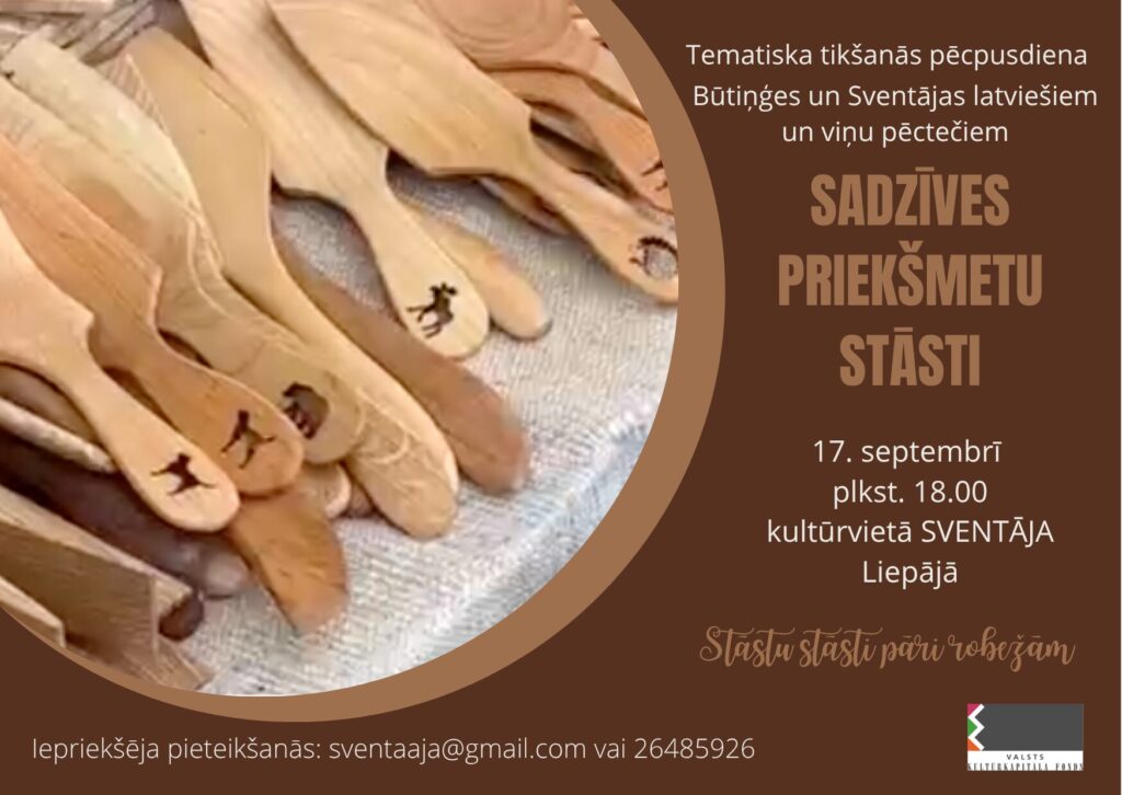 Šajā pasākumā uzmanība pievērsta ikdienas priekšmetiem un to nozīmei. Dalībnieki iepazīs stāstus, kā tapuši dažādi sadzīves priekšmeti – koka karotes, ķoči un citi priekšmeti. Kas ir šie cilvēki, kas tos darinājuši? Praktiskajā daļā notiks sieviešu tautastērpa svārku šūšanas meistarklase. Tas ļauj izprast tradicionālo apģērbu tapšanas procesu. Tikšanās notiek kultūrvietā SVENTĀJA. Pasākums ir daļa no projekta “Stāstu stāsti pāri robežām”. Projektu atbalsta Valsts kultūrkapitāla fonds.