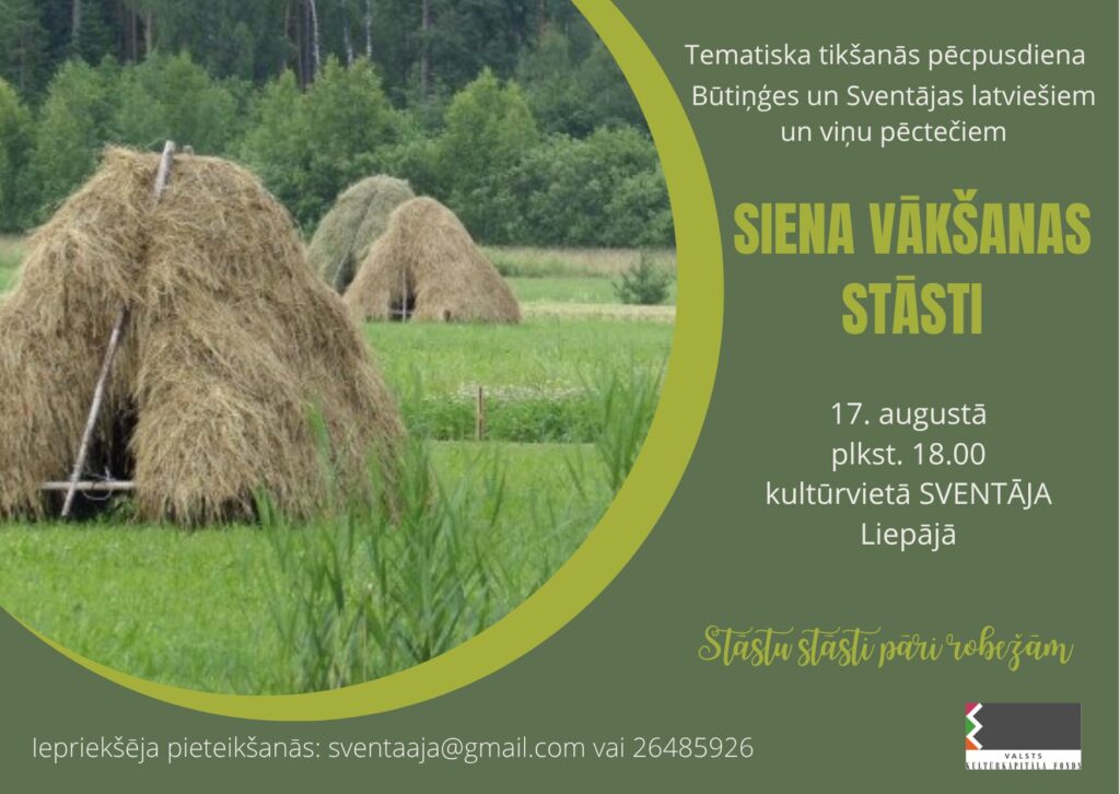 Šajā pēcpusdienā dalībnieki iepazīs senās siena vākšanas tradīcijas un lauku dzīves ritmu. Tiks stāstīts par kopdarba nozīmi un sadzīves paražām vasaras laikā. Praktiskajā nodarbībā turpināsies aušanas prasmes apguve. Tikšanās notiek kultūrvietā SVENTĀJA. Pasākums ir daļa no projekta “Stāstu stāsti pāri robežām”. Projektu atbalsta Valsts kultūrkapitāla fonds.
