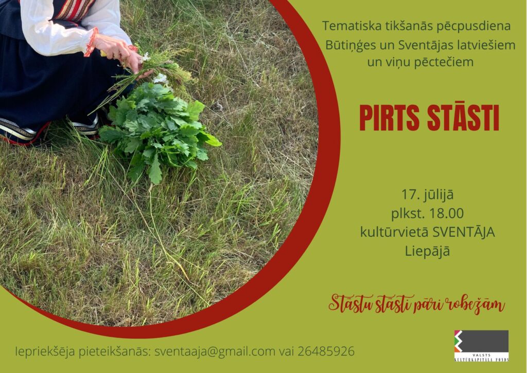 Tikšanās veltīta stāstiem par pirti un pirts tradīcijām. Vai visās saimniecībās bija pirtis? Kāds bija pirts iešanas rituāls? Dalībnieki uzzinās par pirts rituāliem, ārstnieciskajām praksēm un simboliku. Meistarklasē tiks izšūts vīrieša tautastērpa mētelis. Projektu atbalsta Valsts kultūrkapitāla fonds. Tikšanās notiek kultūrvietā SVENTĀJA. Pasākums ir daļa no projekta “Stāstu stāsti pāri robežām”. Projektu atbalsta Valsts kultūrkapitāla fonds.